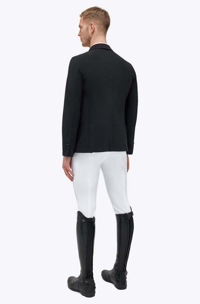 This Cavalleria Toscana men's riding jacket is made from lightweight highly breathable technical material, ideal for summer days. The water repellent fabric combines elegance and performance thanks to antibacterial and UV protections. It fits to the body following your movements, without constriction. The classic cut jacket is closed by three front button and features two front pockets and a breast-pocket. It's refined by an alcantara collar and contrasting piping.
