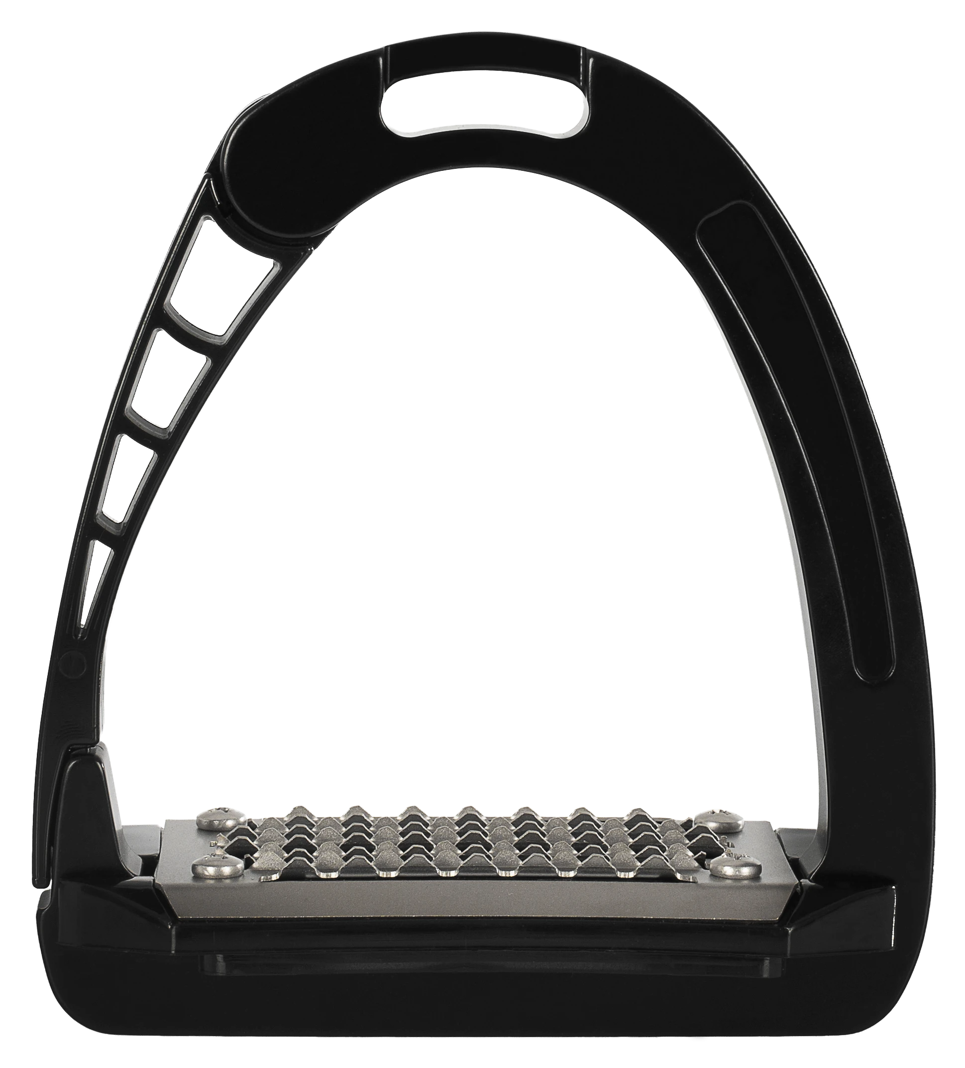 The patented side opening was created using an innovative injection molding technique. The outward opening of the stirrup arm aids in the release of the foot in case of emergency.