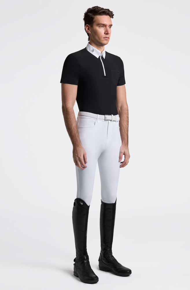 The Cavalleria Toscana Men’s Short Sleeve Competition Shirt is designed to deliver performance and elegance during equestrian competitions. Made from breathable technical jersey, it ensures comfort, freedom of movement, and quick drying. The crisp white poplin collar with hidden snap buttons adds a refined, professional touch. A chest pocket is finished with a subtle tone-on-tone CT silicone patch, while the embroidered logo on the collar enhances the shirt’s signature look. Ideal for warmer show days, this shirt blends functionality, style, and equestrian tradition.